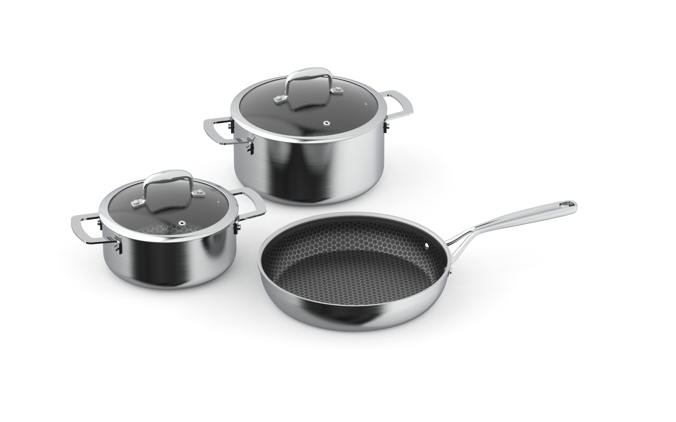 Das 3-teilige InvisaCookware-Set mit antihaft Wabenstruktur ist eine professionelle Kollektion von Töpfen und Pfannen mit einer 3-lagigen Konstruktion, bei der Drei Schichten Edelstahl außen mit einem Aluminiumkern in der Mitte eingebettet sind.